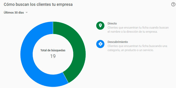 En la sección 'Estadísticas' podrás monitorizar tu perfil de empresa y conocer cómo te buscan los usuarios en Google, dónde ven tus clientes la empresa en Google o qué actividad realizan cuando acceden a tu ficha durante los últimos 30 días. Toda esta información te será de gran utilidad para conocer los patrones de comportamiento online de tus clientes, y te ayudará a adaptar tu perfil a sus necesidades de información.
