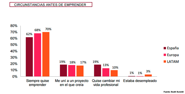 Si nos ponemos a analizar la motivación que lleva a estos emprendedores a tomar este camino, el 62% respondió que es algo que siempre quiso hacer, una vocación. A esta mayoría le siguen un 19% que se unió a un proyecto en el que creía, un 19% lo hizo porque quiso un cambio en su vida profesional y tan sólo el 1% de los encuestados decidió emprender por estar desempleado. Aunque la vocación es fuerte, la cifra de aquellos que emprenden porque siempre han querido hacerlo sigue siendo aún inferior al de otras zonas como Latinoamérica (70%) o el resto de Europa (68%). No obstante, la cifra está en aumento ya que ha crecido un 1% respecto al año anterior.